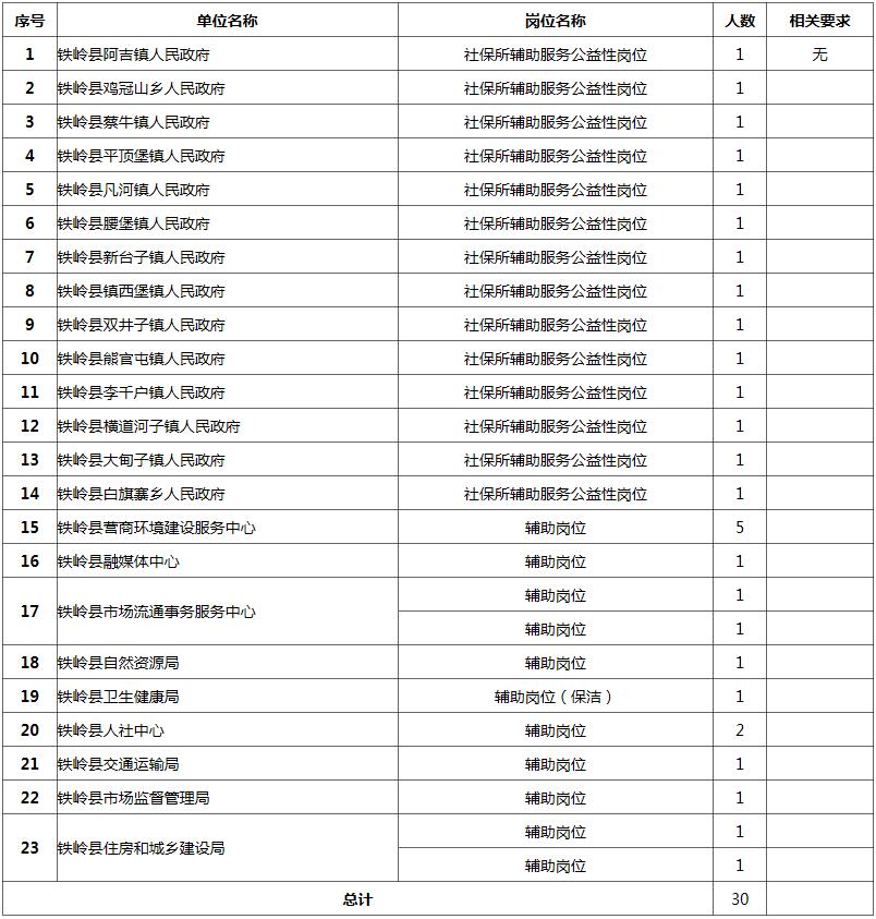根据工作需要,铁岭县23家单位招聘公益性岗位工作人员30人,现具体公告如下: