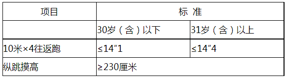 测试方法为:准备测试阶段,受测者双脚自然分开,呈站立姿势。接到指令后,受测者屈腿半蹲,双臂尽力后摆,然后向前上方快速摆臂,双腿同时发力,尽力垂直向上起跳,同时单手举起触摸固定的高度线或高度标识,触摸到高度线或者高度标识的视为合格。测试不超过三次。