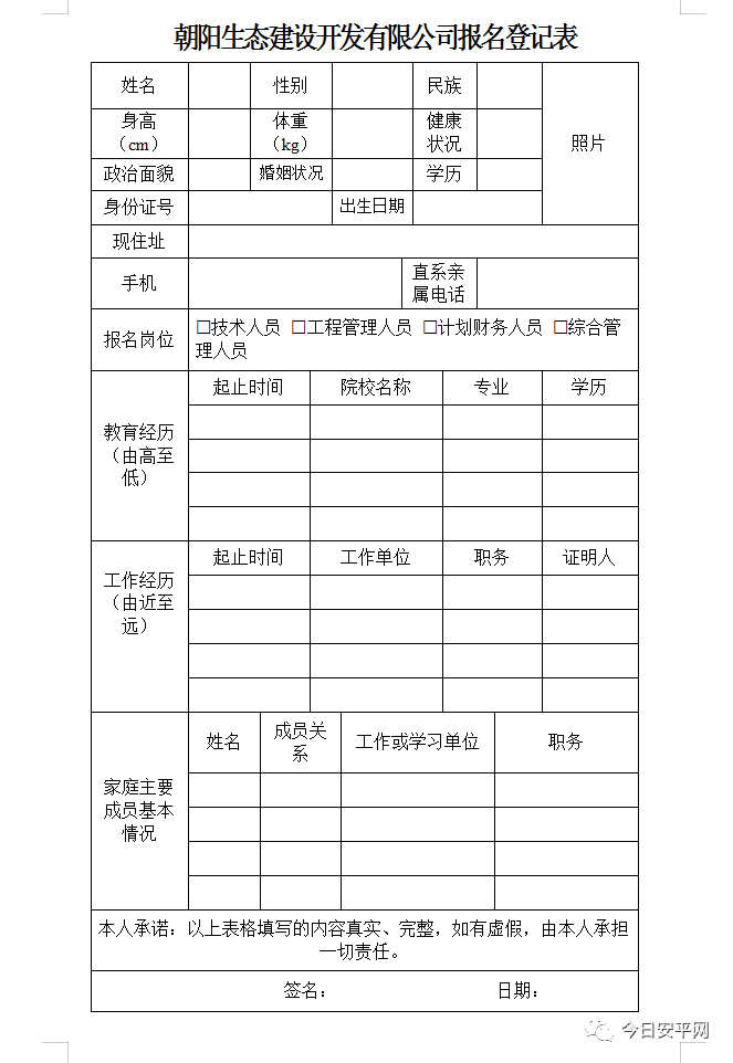 (5)《朝阳生态建设开发有限公司报名登记表》(附件),并需本人手填或电脑打印真实详细信息。本人签名必须本人手填,同时须粘贴近期2寸彩色正面免冠照片(底色无要求);