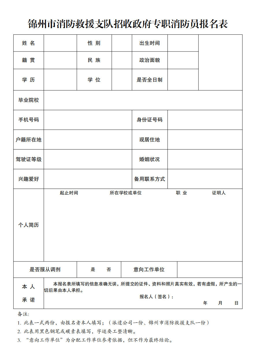 此次政府专职消防员招聘由锦州市消防救援支队组织,信息发布以支队公告为准。本次招聘不举办也不委托任何机构和个人举办辅导培训班,不指定教材和辅导用书,不收取任何报名考试费用(体检费除外),敬请报名者提高警惕,切勿上当受骗。资格审查贯穿招录工作全过程,对提供虚假材料、故意隐瞒实情,及在应聘考核中作弊的,一经查实立即取消聘用资格。报考人员应根据公告安排及时知晓有关信息,并注意接听接收电话和消息通知,因报考人员自身原因未能按时参加招录考核的,视为自动放弃。