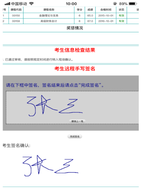 考生核实转入信息后,直接在如图灰色签名区域中用鼠标进行签名,签名过程中可以点击“撤销上一笔”进行撤销操作。签名完毕后点击“完成签名”进行签名确认。