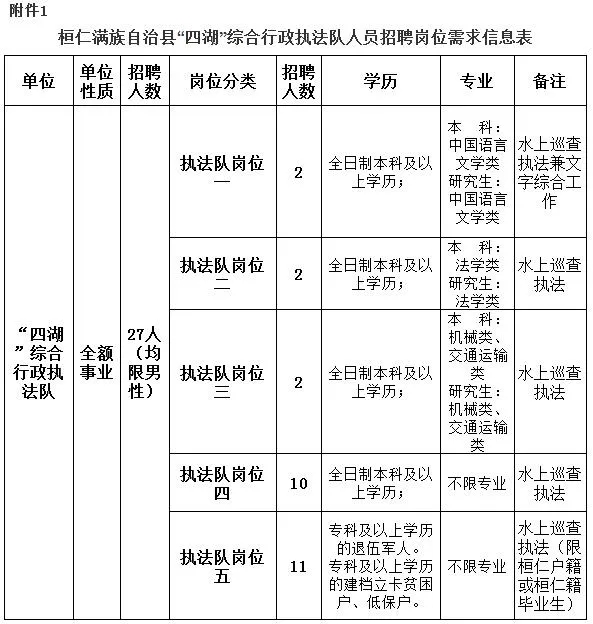 附件1:桓仁满族自治县“四湖”综合行政执法队招聘岗位需求信息表(见下图)