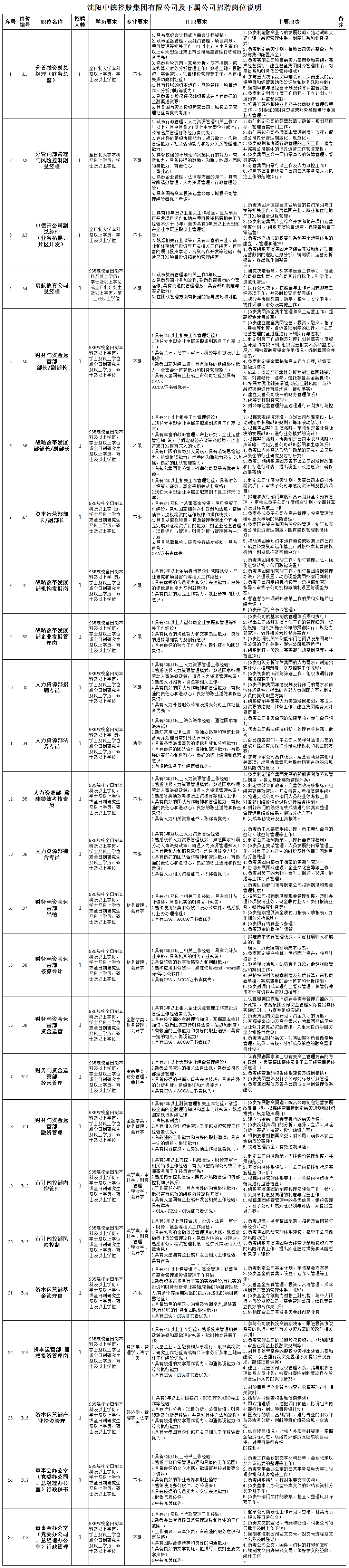 为进一步完善沈阳中德控股集团有限公司的法人治理结构,强化人才队伍建设,本着公开、平等、竞争、择优的原则,拟面向国内外公开选聘各层级职位25个,公告如下: