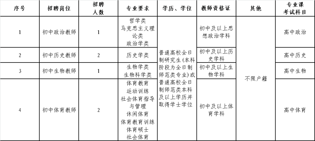 1.初中:a、普通高校全日制研究生(本科阶段所学专业为全日制师范类专业)学历并取得硕士及以上学位,专业对口,取得初中及以上相应教师资格。b、普通高校全日制师范类专业本科及以上学历并取得学士学位,专业对口,取得初中及以上相应教师资格。