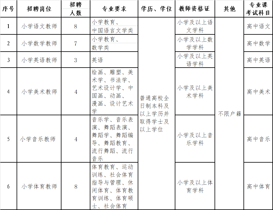 2.小学:普通高校全日制本科及以上学历并取得学士及以上学位,专业对口,取得小学及以上相应教师资格。