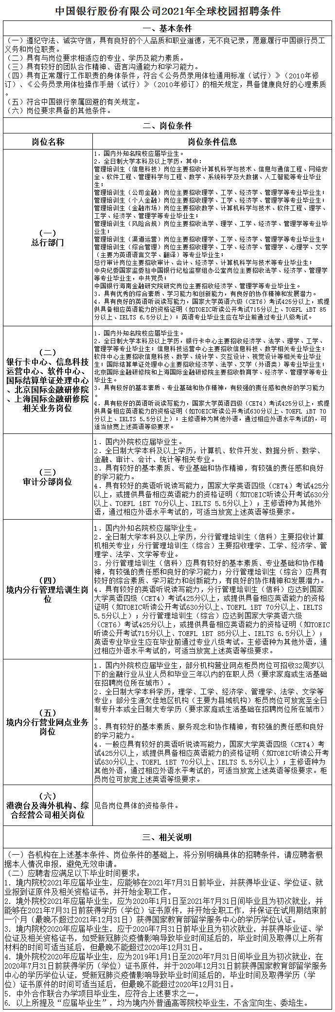 1.中国银行股份有限公司2021年全球校园招聘条件(见下图)