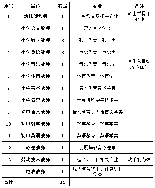 本次拟招聘事业单位合同聘任制教师19人。其中:幼儿部1人;小学12人(小学语文4人、数学2人、英语2人、音乐1人、体育1人、美术1人、信息1人);初中3人(初中语文1人、数学1人、英语1人);公共教师3人(心理1人,劳技1人,电教1人)。