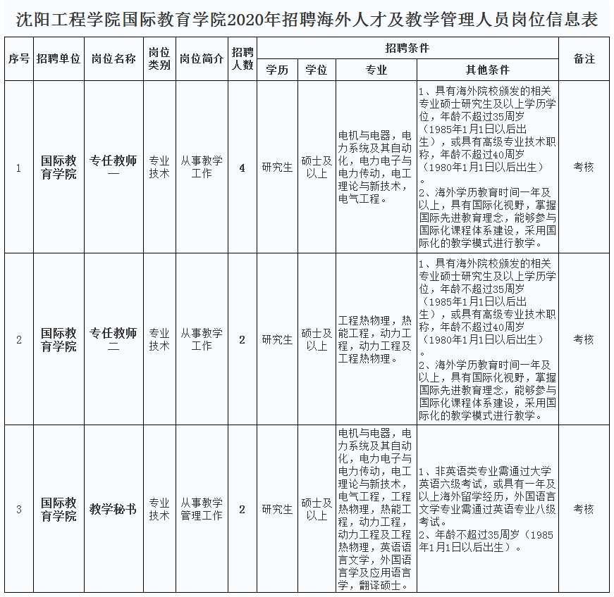 沈阳工程学院国际教育学院2020年招聘海外人才及教学管理人员公告