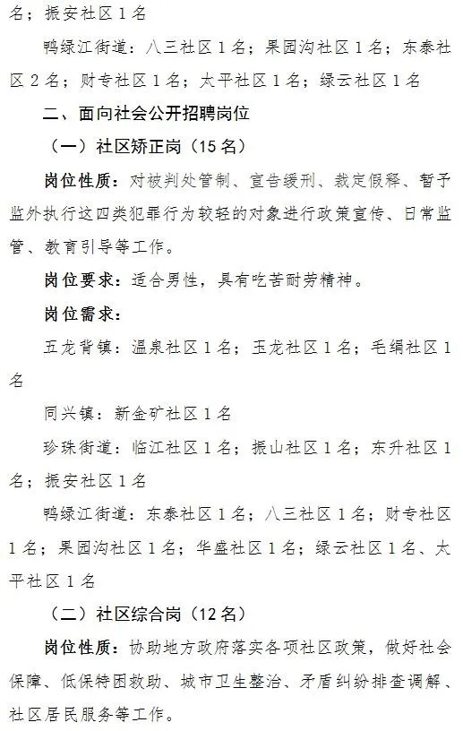 (2)此次招聘社区专职工作者,面向振安区公益性岗位、民政协理员设定16个社区综合岗位;面向社会公开招聘设定社区矫正岗位、社区综合岗位和社区党务岗位,其中社区矫正岗位15个,社区综合岗位12个,社区党务岗位10个(岗位设置见附件)。报考人员在符合条件的岗位中选择报考岗位,每人限报一个岗位,不能重复多报。