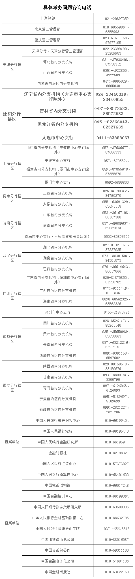 有关笔试、面试和体检的时间、地点和具体安排等相关问题,可咨询中国人民银行各分支机构和直属单位,咨询电话见下表: