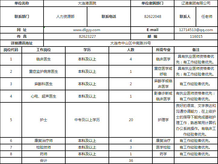 大连港医院始建于1951年10月,隶属于辽宁港口集团,现有床位600张,是一所集医疗、教学、科研、预防、保健、康复于一体的三级综合性医院,是大连市基本医疗保险、工伤保险、工伤康复、企业离休、残障人士康复、脑瘫儿童康复等定点医疗机构,拥有大连及辽南地区设备先进、技术力量雄厚的大型康复中心。现因医院业务发展需要,面向社会招聘专业技术人员,具体事项公告如下: