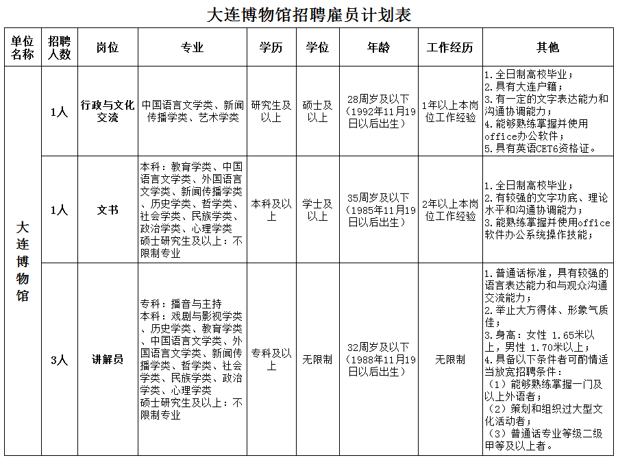 招聘岗位相关情况详见《大连博物馆2020年公开招聘雇员计划表》(附件1)(见文中最下方)。