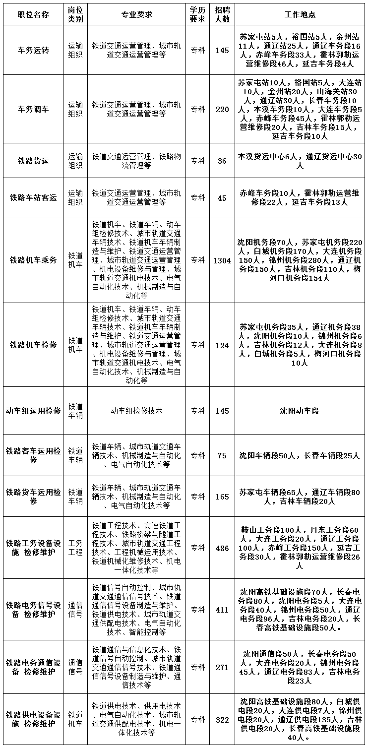 中国铁路沈阳局集团有限公司根据企业发展需要,拟招聘全日制普通高等院校大专(高职)学历毕业生,现将有关事项公告如下: